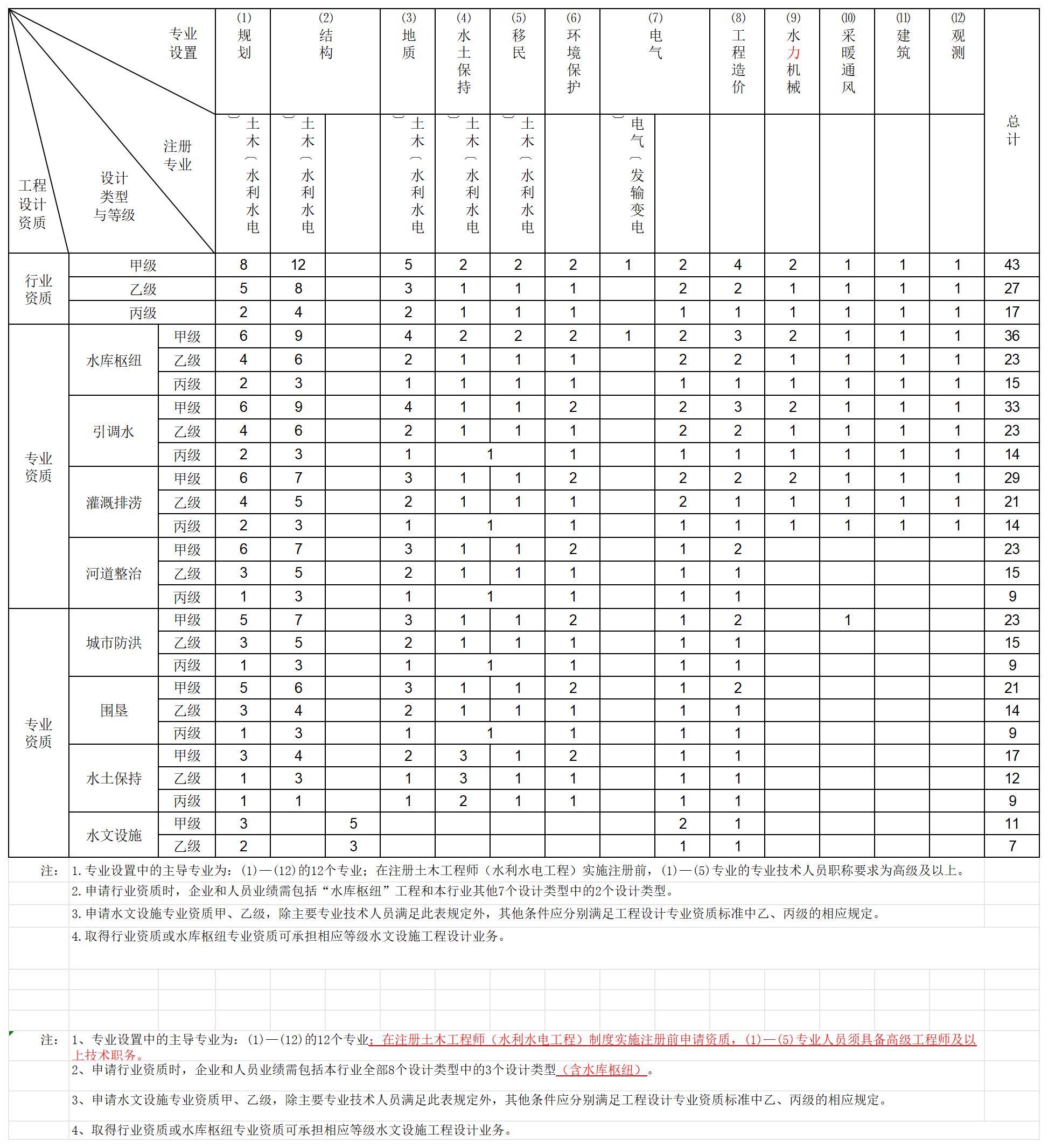 水利行业工程设计主要专业技术人员配备表