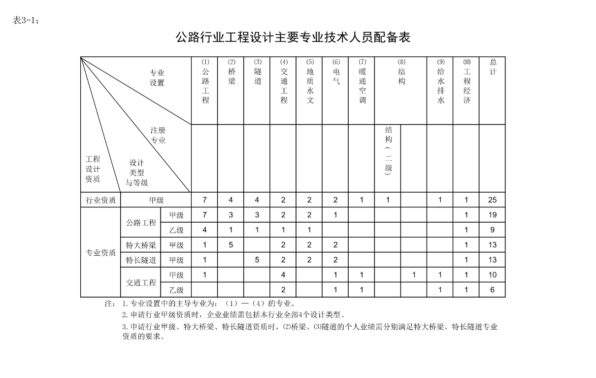 表 3-1 公路行业工程设计主要专业技术人员配备表