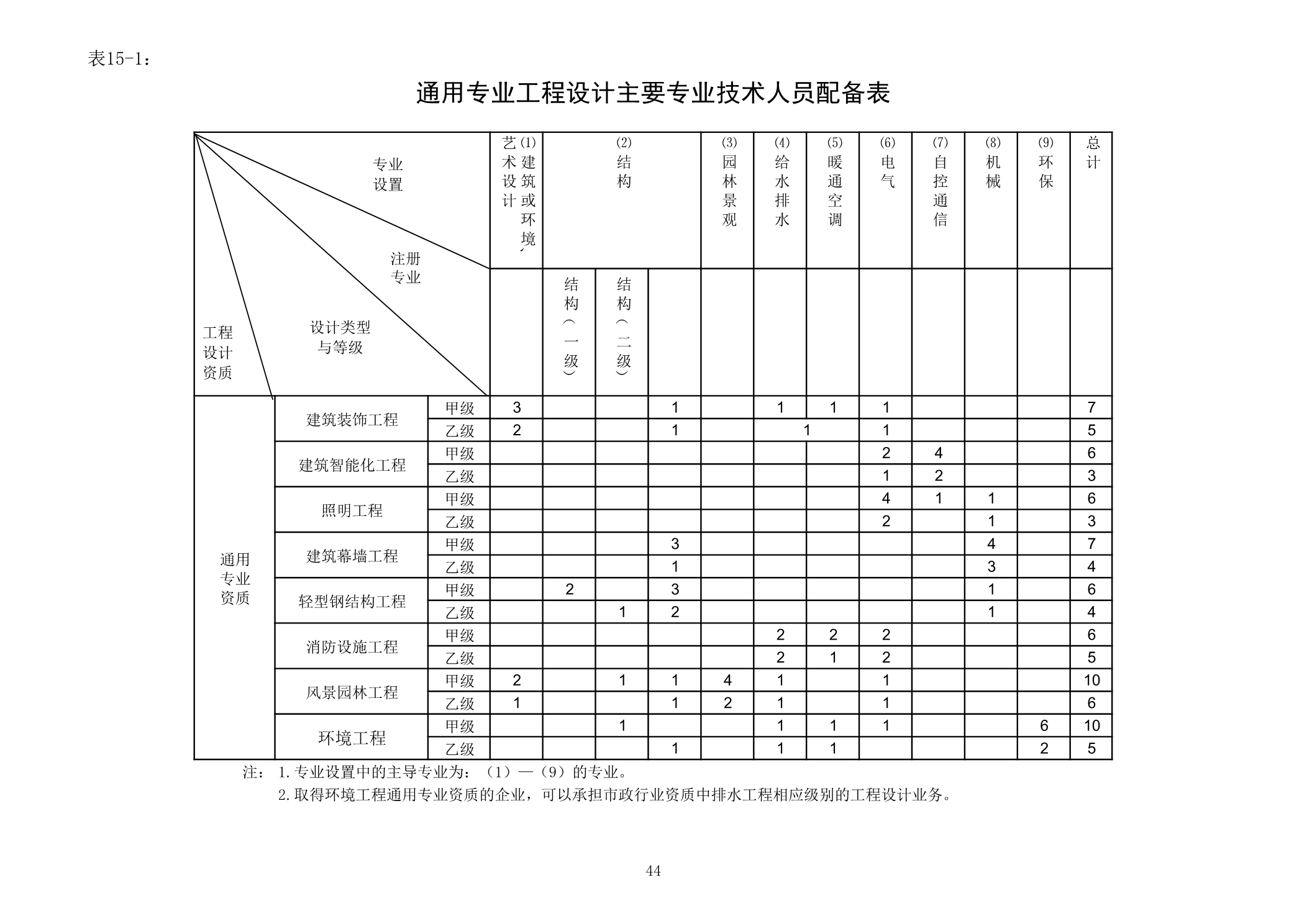 13.工程设计主要专业技术人员配备表中,几个专业岗位共同配备一定数量的专业技术人员,是指人员总数达到标准要求的数量即可,每 1 个专业岗位的人员数量不作要求,也不要求专业岗位齐全。