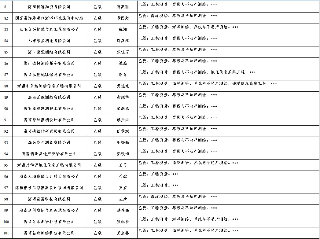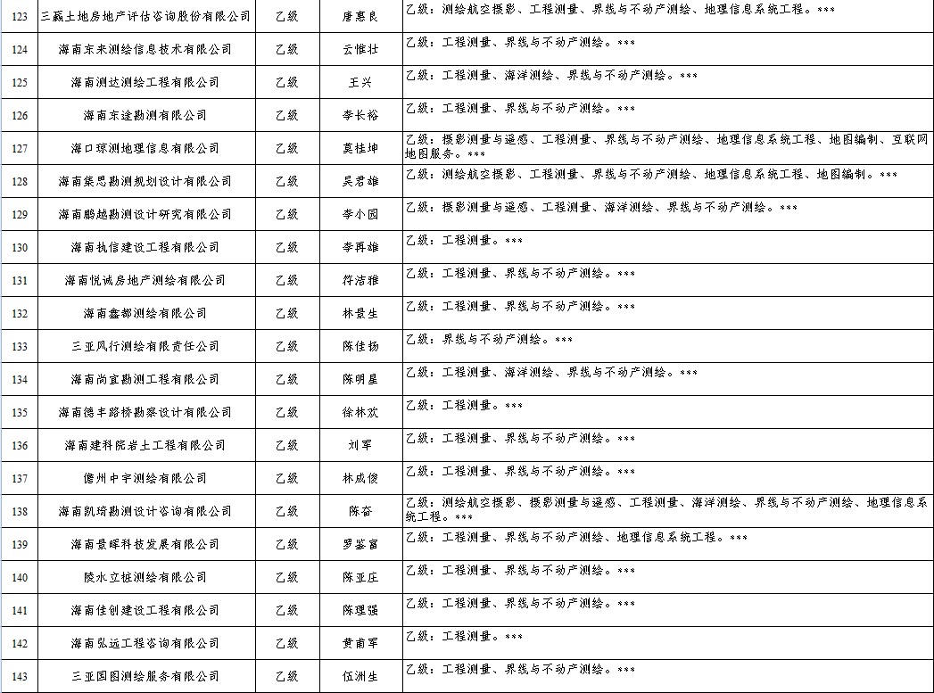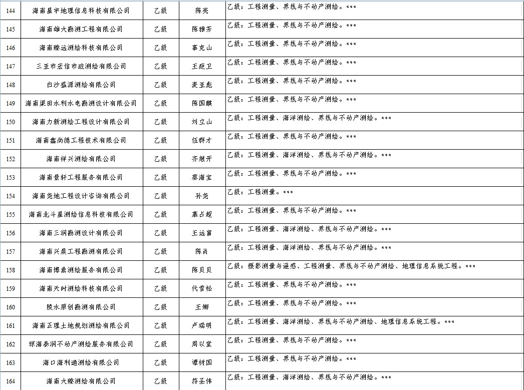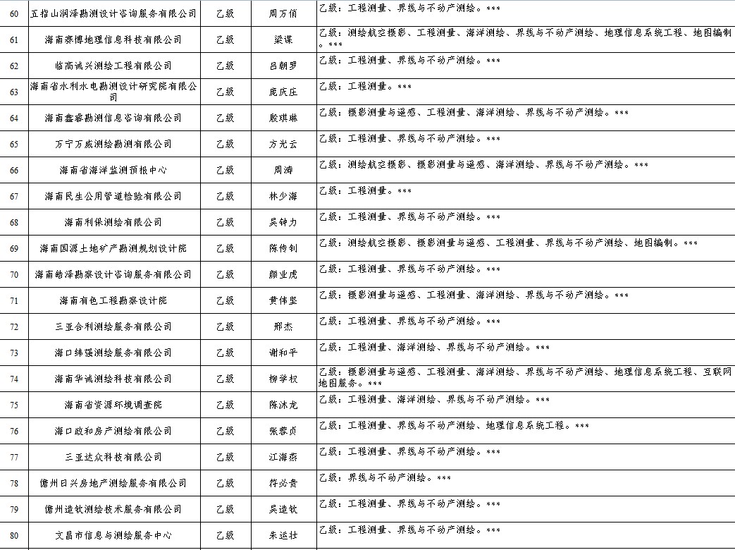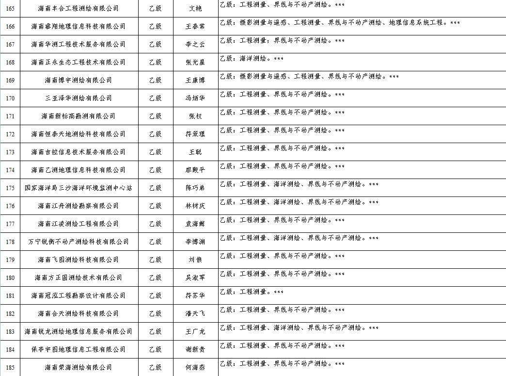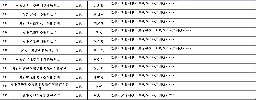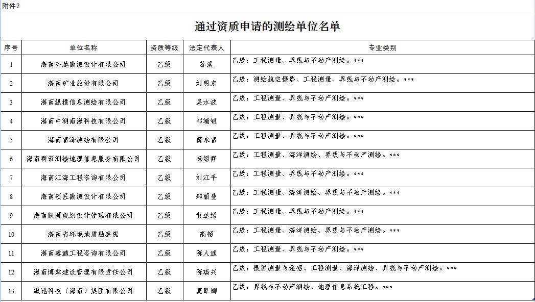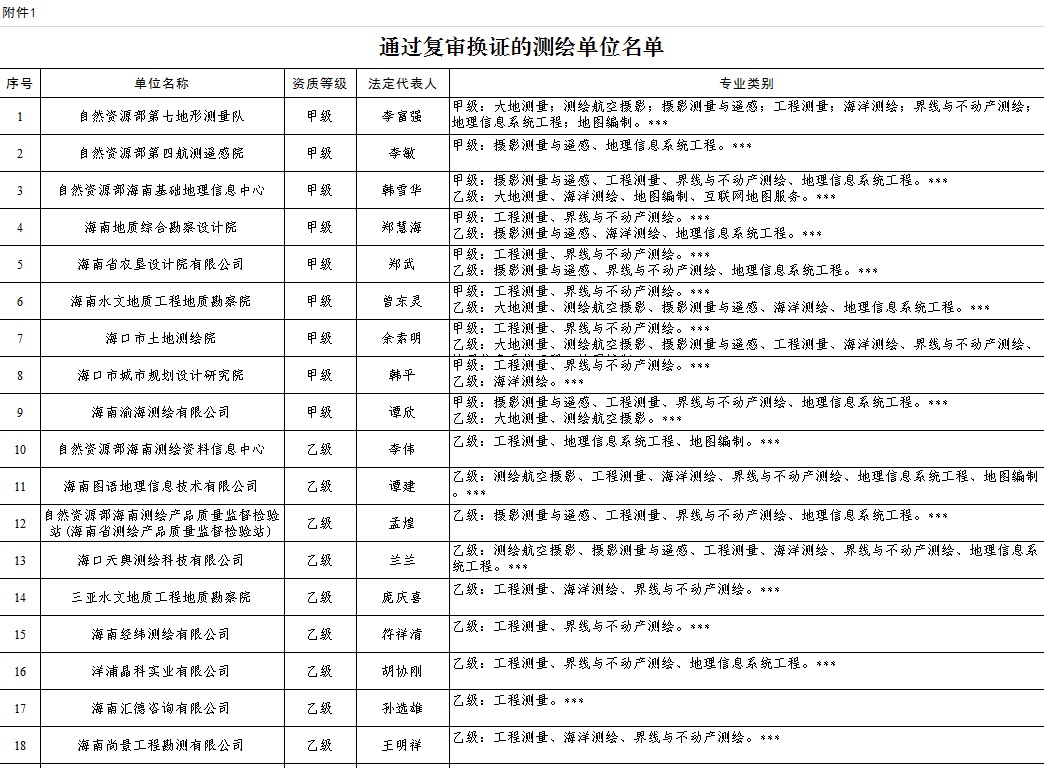 根据《自然资源部办公厅关于印发测绘资质管理办法和测绘资质分类分级标准的通知》(自然资办发〔2021〕43号)、《自然资源部办公厅关于开展测绘资质复审换证工作的通知》(自然资办发〔2021〕46号)和《海南省测绘地理信息局关于开展测绘资质复审换证工作的公告》,经测绘资质单位申请,省测绘地理信息局审核,到目前为止,我省共有196家测绘单位通过了资质审核,13家测绘单位通过了资质申请。现将通过的测绘单位名单予以通告。