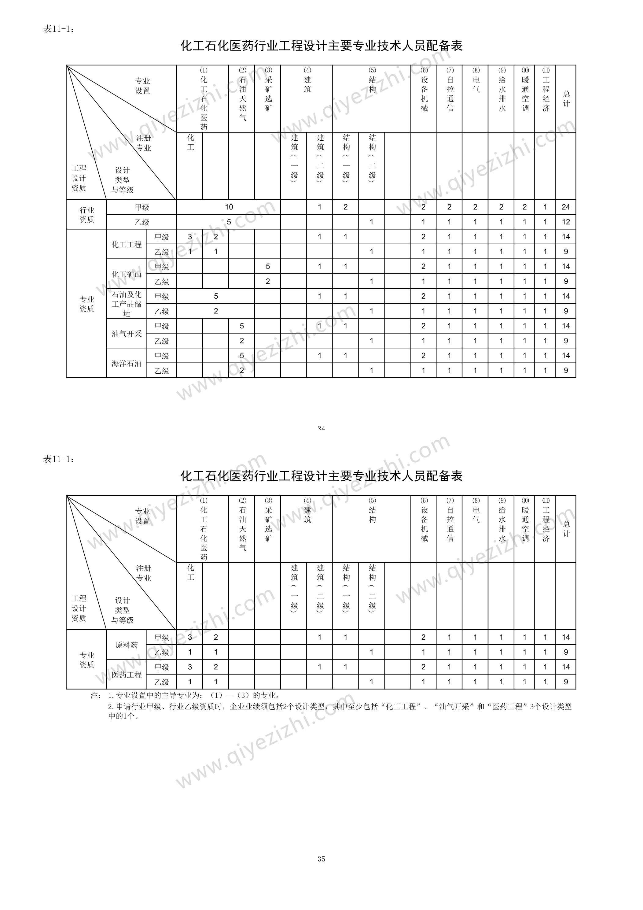 表 11-1 化工石化医药行业工程设计主要专业技术人员配备表
