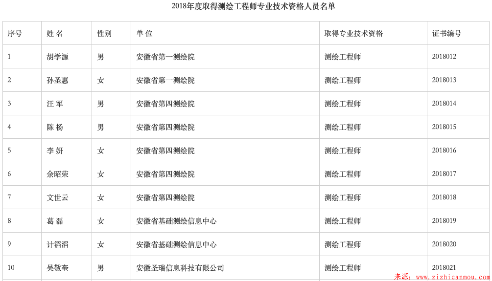 名称:安徽省自然资源厅关于胡学源等20位同志具备测绘工程师专业技术资格的复函